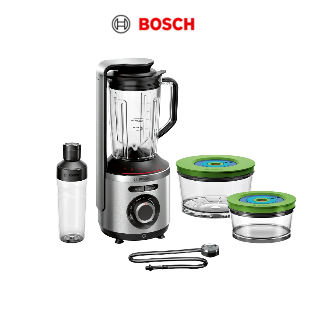 Le Blender Sous Vide Bosch VitaPower Série 8 MMBV625M allie puissance, technologie sous vide et design haut de gamme pour préserver la fraîcheur et les nutriments de vos préparations. Grâce à son moteur puissant de 1000 W atteignant jusqu’à 37 000 tours/minute, il réduit l’oxydation et conserve mieux les vitamines, la couleur et le goût des smoothies, soupes et sauces.